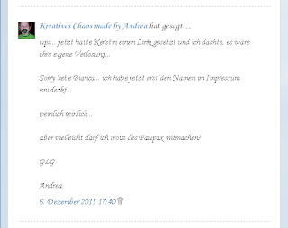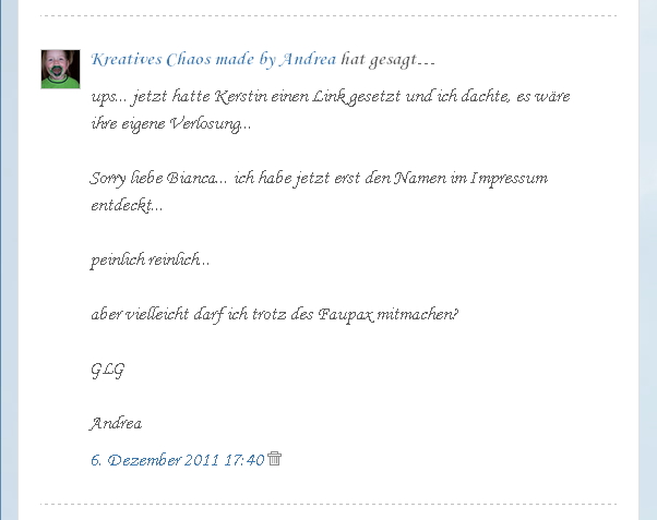 Liebe Andrea, bitte sende mir doch deine Adresse per Mail zu. Ich werde dir das Gewinnerpäckchen dann nächste Woche zusenden.