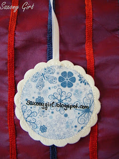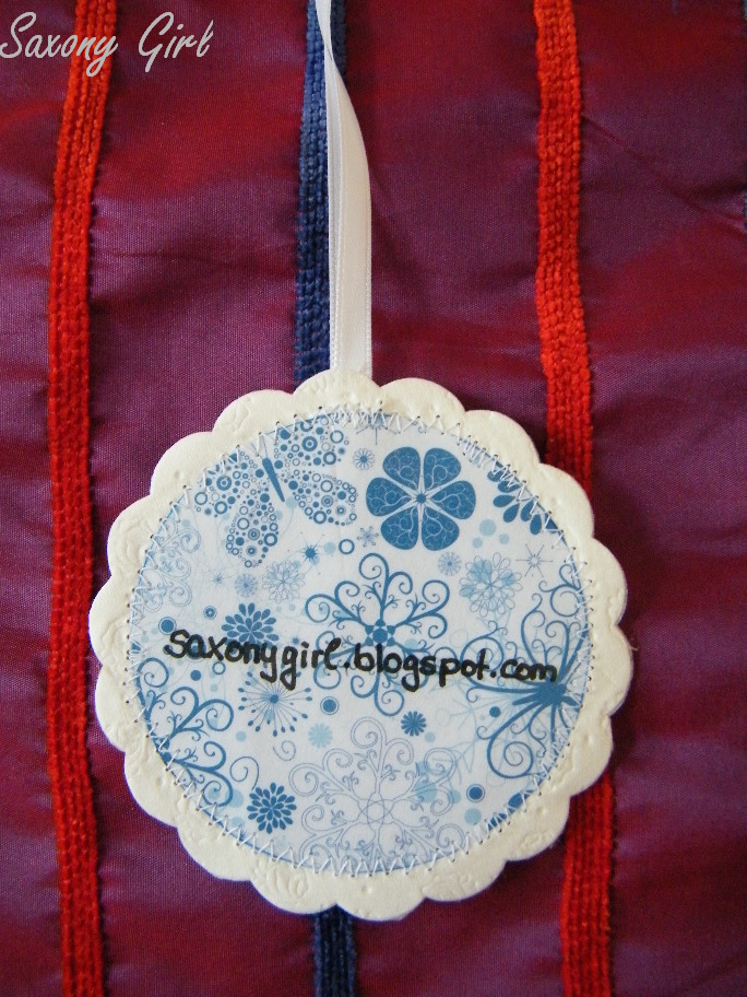 Den Button habe ich aus Papier, Tassenuntersetzern und Folie (zum Schutz der Schrift) gebastelt. Aber trotz Kleberei die Einzelteile zum Schluss nochmals mit der Nähmaschine im Zick-Zack-Stich umrandet und so komplett verbunden. Das Band habe ich zwischen die beiden Tassenuntersetzer genäht.