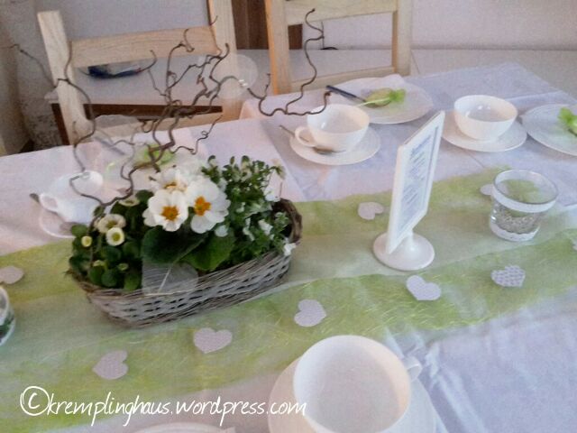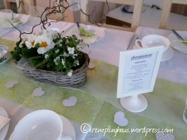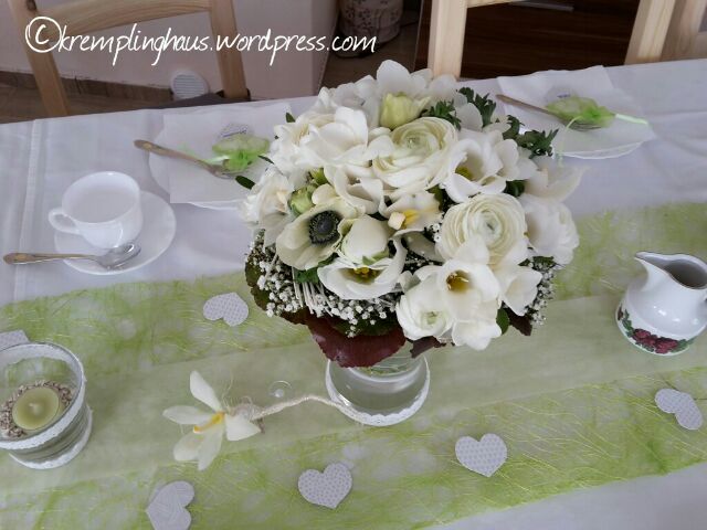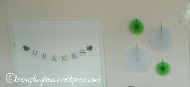In Sachen Deko habe ich alles geplant, für den Mann war das nix. Frauensache halt. Aber er hat mich beim dekorieren ganz toll unterstützt. Unser Farbschema war passend zu unserem neuen Heim weiß, grün und creme. Das sind unsere Farben hier im Haus, es wirkt schön frisch.