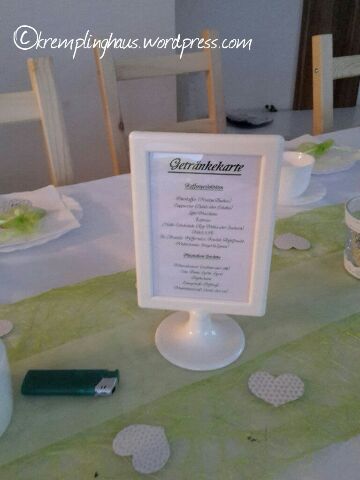 Dann hatte ich noch Getränkekarten erstellt und in schlichten Bilderrahmen mit auf den Tisch gestellt. Eine Seite waren die Heißgetränke und die Alkoholfreien Getränke, auf der anderen Seite die Alkoholika. Der Hintergrund für die Karten war eigentlich, dass wir wollten, dass unsere Gäste sehen, was es alles zu trinken gibt, ähnlich wie in einer Gaststätte, und uns nicht ständig fragen, was wir so haben. Tja und was haben die Gäste gemacht? Richtig, sie fragten nach was wir an Getränken haben. Ich habe dann nur auf die Karte verwiesen. Die Karten werden nun für weitere Feiern aufgehoben und gegebenenfalls angepasst.