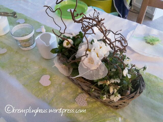 Die Blumendeko habe ich im örtlichen Blumenladen, zusammen mit meinem Brautstrauß und dem Herrenanstecker, machen lassen. Die Bestellung hatte ich schon 2 Monate vor der Hochzeit aufgegeben. Da wollte ich wirklich auf Nummer sicher gehen. Ich wollte auch nichts was schnell verwelkt und dann weggeworfen werden muss. Ich bin eh nicht der Typ für Blumensträuße, sondern habe lieber was zum Einpflanzen oder im Topf, denn da hab ich mehr davon. So gab es zwei längliche Holzkörbchen mit dreierlei Frühlingsblumen. Bellies, Primeln und Hornveilchen in weiß, dazu noch ein paar Weidenzweige und Moos. Der Blumenladen hat dann noch ein paar weiße Blätter und Perlen mit dran gemacht. Wunderschön und total passend zum gesamten Dekokonzept.