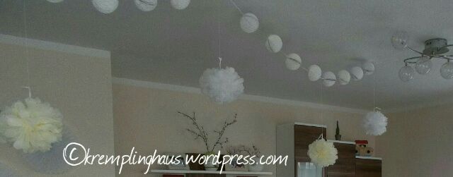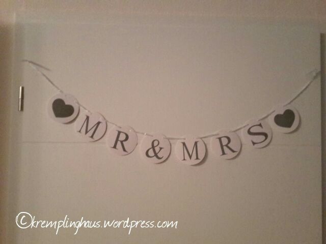 An der Decke zwischen unseren Lampen hatten haben wir zwei Girlanden mit Wabenbällen und Pompons in weiß und creme gehangen. Die hängen immer noch und bleiben vermutlich auch hängen. Das sieht so schick aus und die Kinder schauen es auch immer gern an oder stupsen mal mit dem Kopf dagegen wenn wir sie auf dem Arm haben. An der Wand hingen Fächerrosetten in weiß und hellgrün. Zudem hatten wir 2 Mr&Mrs-Girlanden. Eine mit grauen Herzen, eine mit roten Herzen. Die Graue hatten wir an die Wohnzimmertür gehangen und die Rote an die Heckscheibe vom Auto.