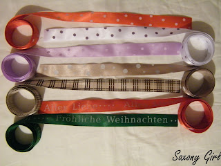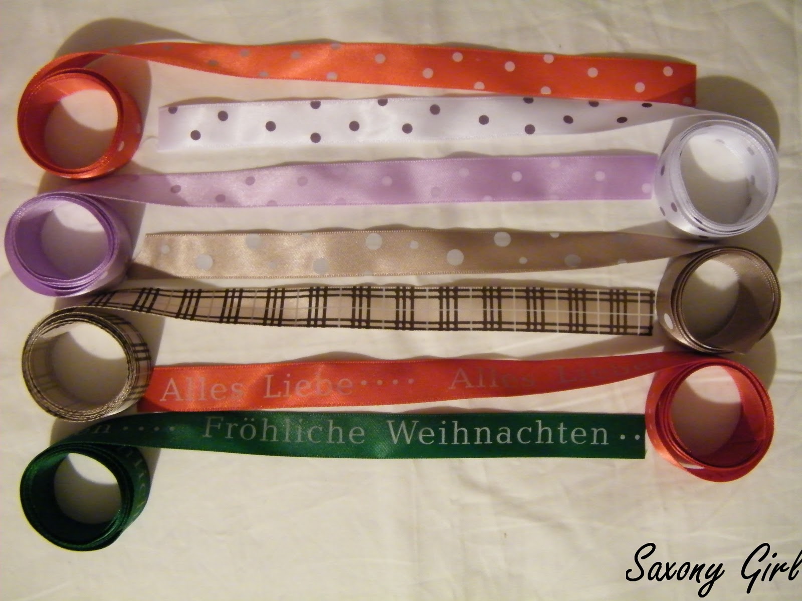 7 wundervolle Bänder von je 1m Länge. Sie sind gewebt, auf der einen Seite glänzend und mit je einem Musteraufdruck. Man kann sie für Geschenke verwenden oder auch vernähen. Habe ich selber schon ausprobiert, funktioniert prima und sieht durch die glänzende Oberfläche schön edel aus.