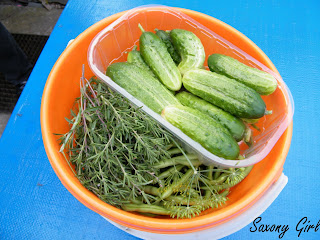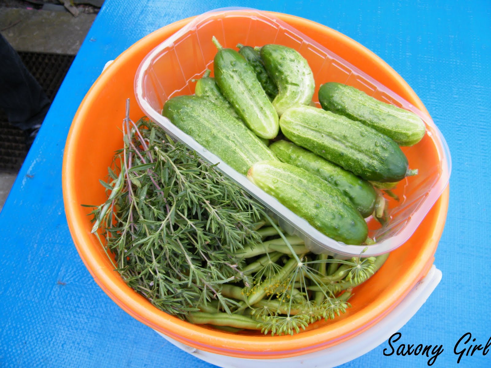 Wieder frisch geerntet: Bohnen, Gurken, Dill und Bohnenkraut. Mmh, das gibt leckere Schüttelgurken.