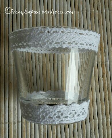 Deko-Spitze oben und unten auf die Teelichtgläser kleben. Ich habe dabei immer die Enden etwas übereinander gelegt, damit man ein geschlossenes Band hat. Oben ist meine Spitze schmaler als unten, das finde ich einen schönen Kontrast. Wenn das dann fertig ist, wird das Deko-Granulat eingefüllt. Ich habe in meine Gläser immer so 100 g eingefüllt, dass ergab eine schöne Höhe. Das Granulat habe ich dann etwas fest gedrückt, damit die Oberfläche etwas eben ist.