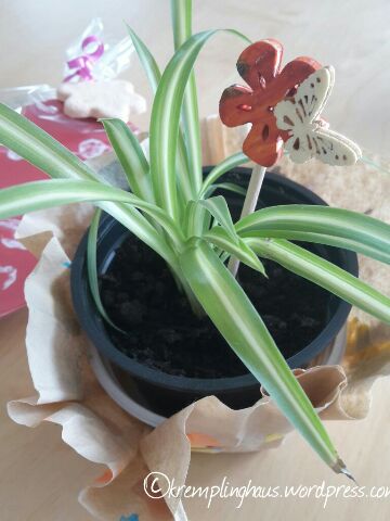 Sehr süße Geschenke. Und die gebastelten sind doch die Besten. Die Pflanze steht hier auch und ist sehr pflegeleicht und sie vermehrt sich gut, sie hat immer kleine Absenker dran und wird immer größer.
