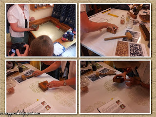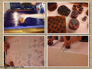 u.l.: unsere Probestücke, u.r.: jeder bedruckte sich ein Stück Stoff mit Motiven seiner Wahl