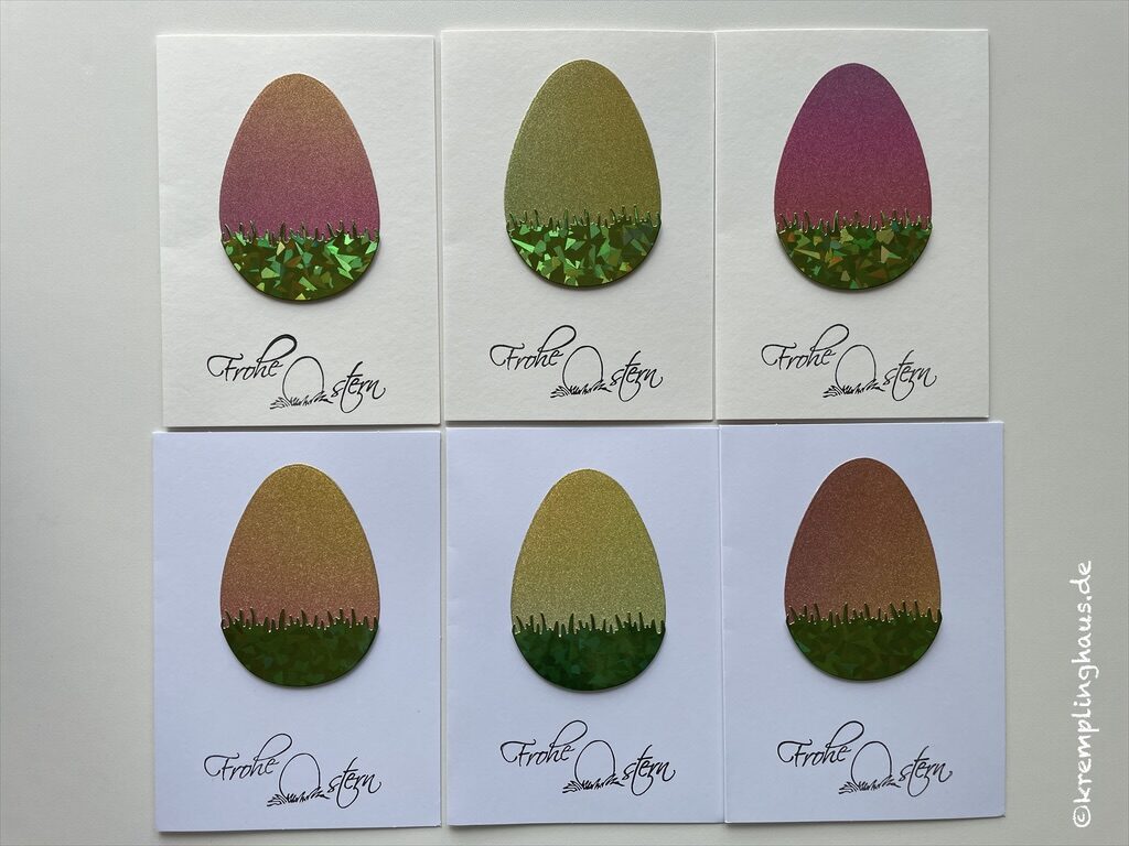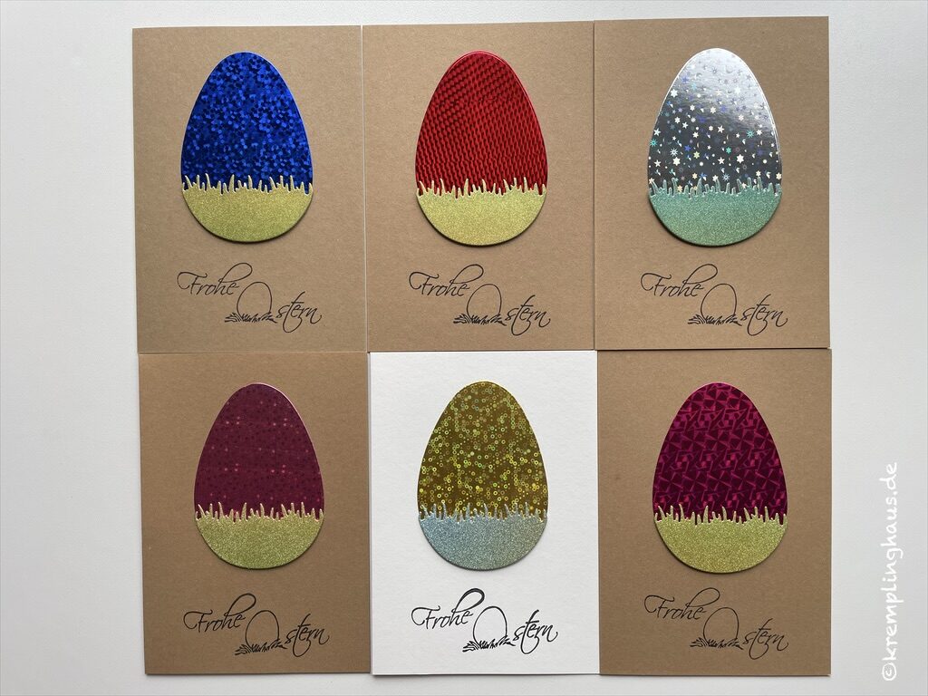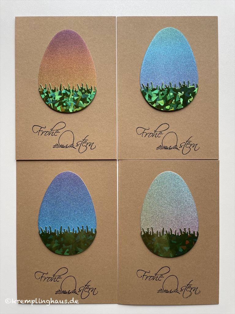 Den Anreiz für das diesjährige Thema gab mir die Entdeckung von Glitzer- und Holographic-Bastelpapier in diversen Läden mit guter Bastelkram-Abteilung, aber auch bei Discounter-Angeboten. Bisher wusste ich nie, was ich damit machen könnte, aber nach der Benutzung meiner Eier-Stanzen (*Amazon-Affiliate-Link) im letzten Jahr, hatte ich dieses mal ein direktes Bild für die Osterkarten im Blick. Es ist sehr erstaunlich wie gut sich Glitzer- und Holographic-Papier kombinieren lässt ohne überladen zu wirken.