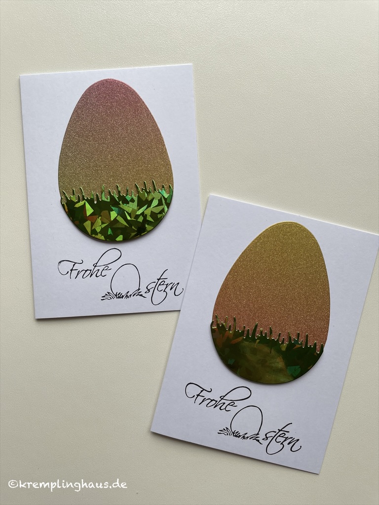 Bei der Kombination von Ei und Gras habe ich immer darauf geachtet, dass ein Teil aus Glitzerpapier ist und der andere aus Holographic. Das ergibt einen sehr schonen Kontrast und wird nicht too much. Wobei sich sicherlich manch einer sagen würde, dass allein Glitzer + Holographic schon zu viel ist. Man muss aber sagen, hierbei finde ich die Verbindung von glatt zu rau bei den Papieren sehr schon und als perfekte Gegensätze.