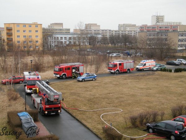 Ich hatte ja Nachtschicht gehabt und lag friedlich schlummernd in meinem Bett, als das Tatü-tata mich aus den Träumen riss. Zwar ist Tatü-tata für mich nichts ungewöhnliches, den ich wohne so zentral in Riesa, das ich fast täglich irgendein Tatü-tata habe. Nur sonst wurde das dann immer leiser, diesmal nicht. Als dann auch noch ungewohnte Geräusche und Stimmengewirr durch die geschlossenen Fenster drang, wurde ich doch stutzig. Ein Blick aus dem Fenster offenbarte dann folgendes: