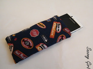 Danach wurde gleich der eigentliche Stoff angeschnitten und vernäht. Das Endergebnis ist gut geworden und das Handy nun ideal aufgehoben. Außen dunkelblau mit Ami-Straßenschildern und Innen dunkelblauer Sternchenstoff, gepolstert wurde mit Vlieseline H630.