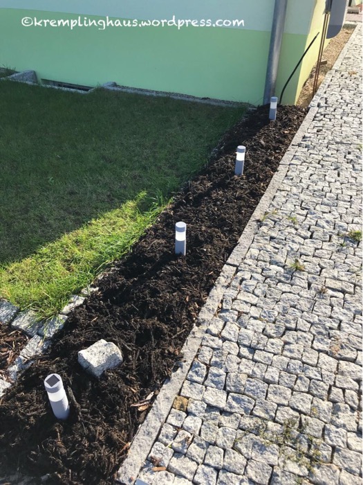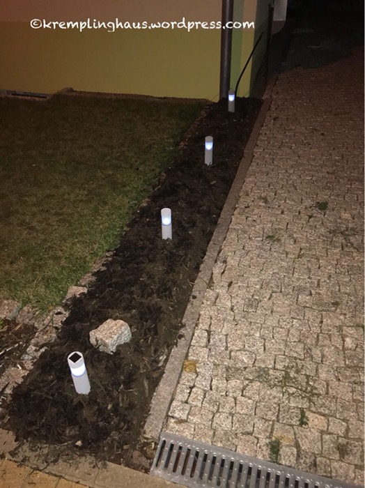 Im Vorgarten setzen wir auch ein paar Solar-LED-Leuchten, die wir geschenkt bekommen haben. Als ich nach 22 Uhr von Arbeit heimkomme, leuchten sie sogar immer noch. Tolle Technik.
