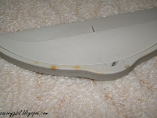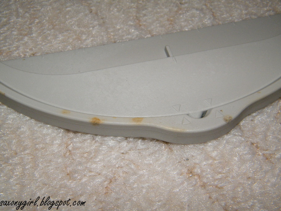 Doch damit nicht genug. Mitten im Sticken machte das Maschinchen dann kurz ein paar komische, aber schon von der alten Maschine her bekannte Geräusche. So ein lautes Tack-tack. Hat mit die Nadel doch tatsächlich ne Kerbe (siehe roter Kreis) in die Stichplatte gehämmert. Oh neeeeeee.
